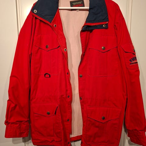 Jacka i bomull i storlek M med orange rutig design. Passar som ytterplagg vid olika tillfällen. Knappt använd!