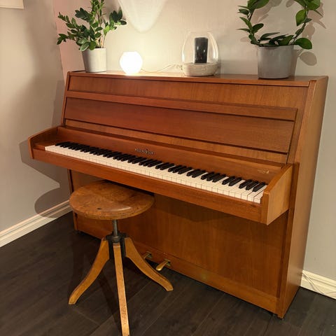Piano, stilrent och inte alltför tungt. Ett Wilh. Steinmann. Bredd 145 cm, höjd 110 cm, djup 55 cm.