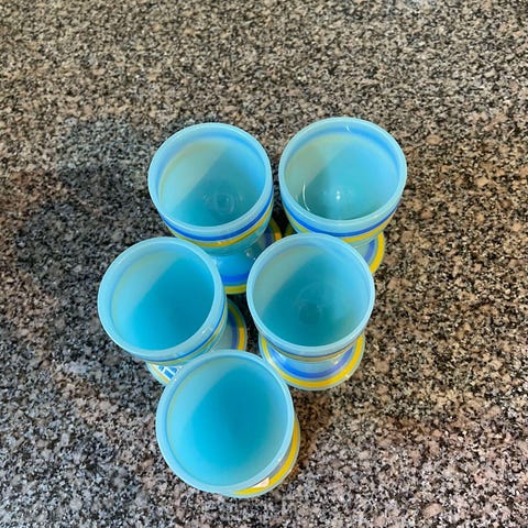 4 st äggkoppar/ minivaser ur serien Birdy, formgivet av Ulrica Hydman för Kosta Boda glasbruk under 90 talet. Samma motiv med kycklingen på fram och baksida.