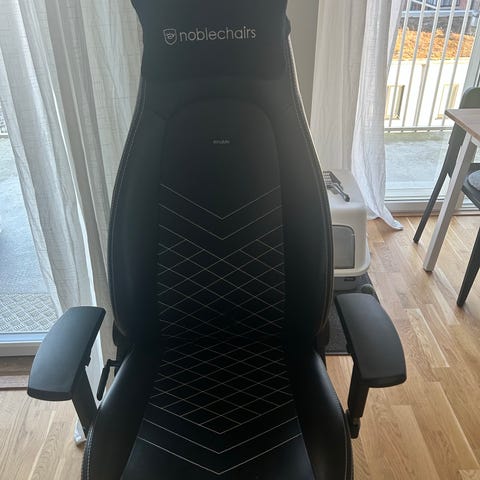 BlackLyte gamingstol med svart och vita detaljer. Stolen är utrustad med justerbara armstöd och en nackkudde för extra stöd. Materialet är syntetiskt läder och stolen har en stabil bas med hjul för enkel förflyttning. Passar för spel och kontorsarbete. Använd 1 gång. Bara upppackad och ihop monterad