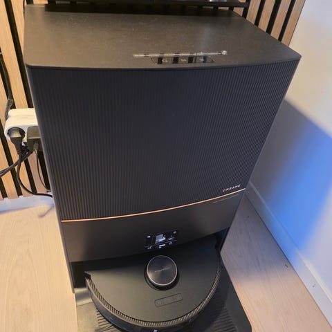 Dreame x40 ultra/ ultra Complette robotdammsugare med tillhörande laddstation i vit färg. Produkten är avsedd för automatiserad golvrengöring och är utrustad med en laddningsstation för enkel återuppladdning.