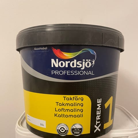 Nordsjö Professional Täckfärg i 10 liters förpackning. Produkten är avsedd för målning och ger täckande färgresultat. Vi har målat tak och snickerier. Har en 10 liters hink över.