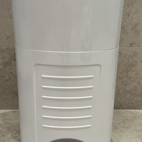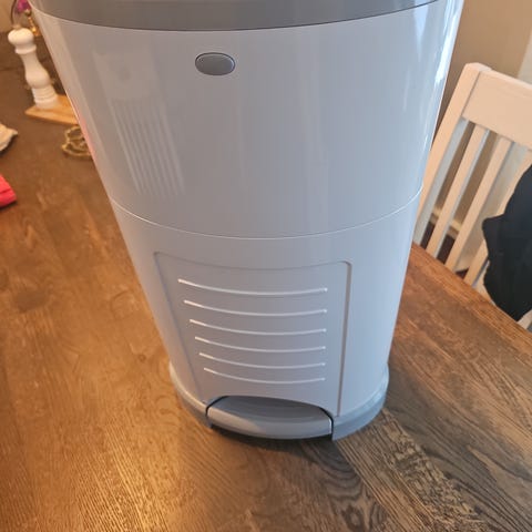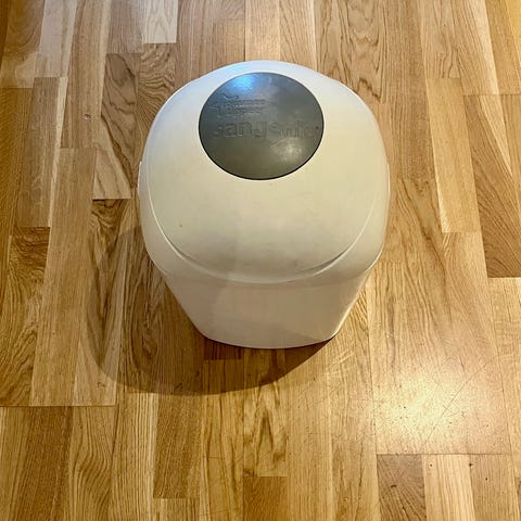 Tommee Tippee Sangenic blöjhink med lock, designad för hygienisk förvaring av använda blöjor. Produkten är tillverkad i plast (lätt att rengöra) och har en rundad form med en tryckknapp för öppning av locket. Den är lämplig för användning i hemmet för att underlätta hantering av blöjavfall. Minskar dålig lukt- lifesaver! Ingår en cassette och 1 refill så att man kan köpa bara plastpåsen typ från Amazon istället för Tommer Tippee refills.
