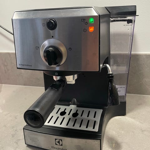 De'Longhi espressomaskin i blå färg. Maskinen har flera knappar för olika funktioner och levereras med tillbehör för bryggning av espresso. Passar för hemmabruk och förberedelse av espressobaserade drycker.