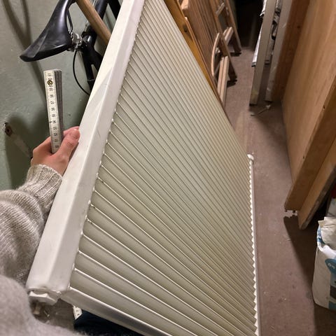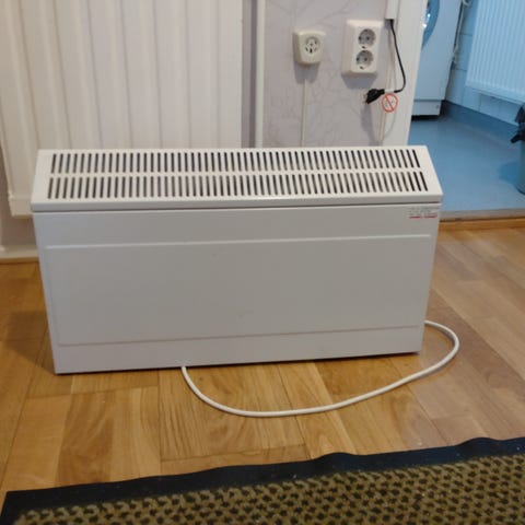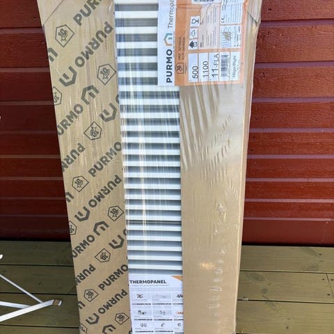 Vitt vattenburet element/radiator. Monteras på vägg, finns fyra fästen.