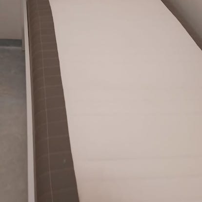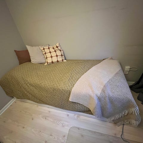 IKEA säng med träben. Sängen är klädd i ett ljust tyg och har ben i trä. Passar för enkelrum eller gästrum. Bäddmadrass inklusive.