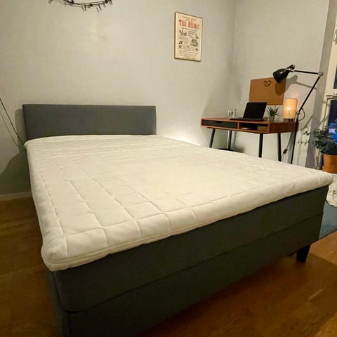IKEA säng med tillhörande madrass och bäddmadrass. Sängen är klädd i ljusgrått tyg och madrassen är vit.