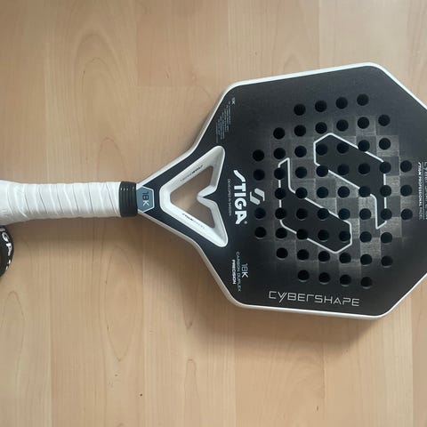 Stiga Cybershape padelracket i svart och vit färg. Racketet har ett hålmönster i träffytan och är utrustat med handledsrem för säker användning.