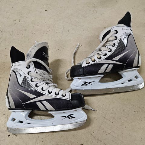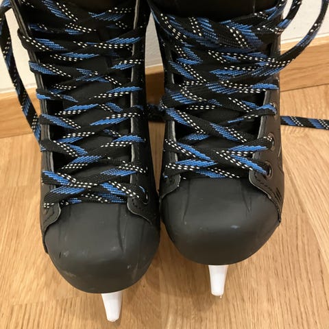 Ishockeyskridskor för barn i storlek 26/33. Ett par är svarta och vita med spänne och ett par är vita med rosa detaljer och spänne. Skridskorna är anpassade för ishockey.