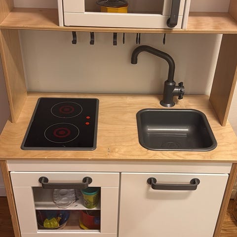 IKEA Duktig lekkök barnmöbel i vit färg. Köket är utformat för barn och inkluderar funktioner som diskho, spis och ugn. Materialet är anpassat för lek och barnanvändning.