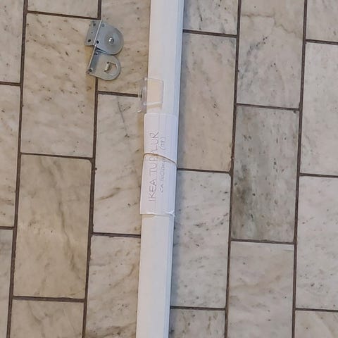 Mörkläggande rullgardin med kulkedja och beslag som går att fästa på väggen eller taket.
