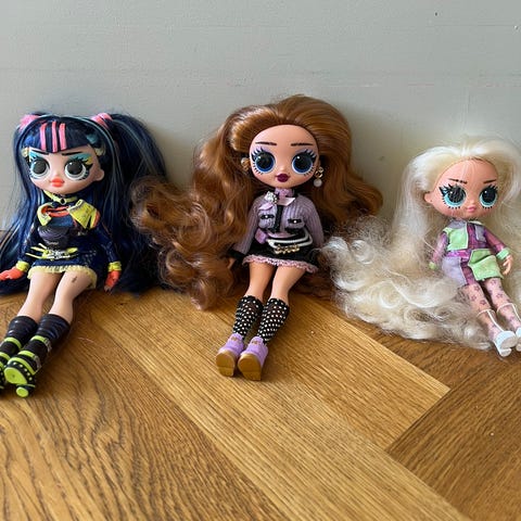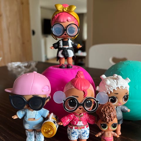 Min dotter säljer sin samling av L.O.L. Surprise dockor och tillbehör inklusive några stora dockor, flera små dockor, kläder, skor, accessoarer och leksaksföremål. Setet innehåller även olika typer av förvaringsbehållare.