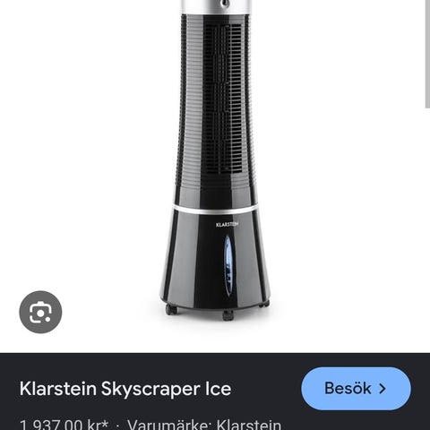 Vit tornfläkt. Höjd 80, Bredd/Djup 30cm. Variabel hastighet. Kan ställas in till att blåsa i en riktning, eller svepa luftströmmen över en yta.