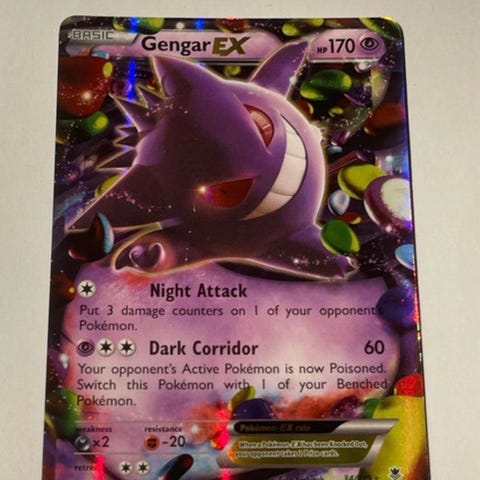 Pokémon GX Tag Team Gengar & Mimikyu samlarkort med holografiskt motiv. Kortet är i skyddsfodral och visar fram- och baksida. Passar för samlare och spelare av Pokémonkort. Otroligt bra skick och värt jättemycket!