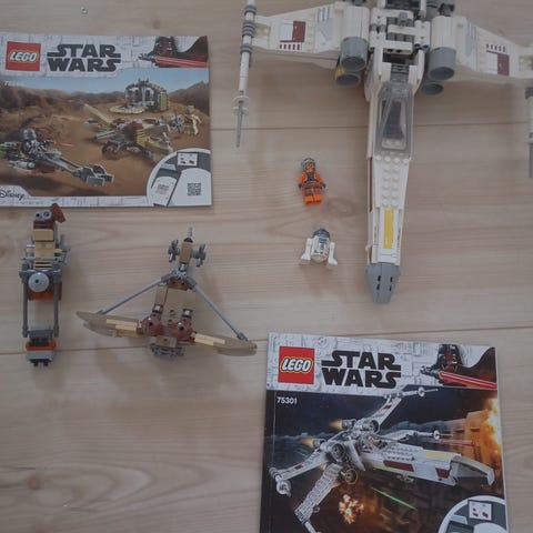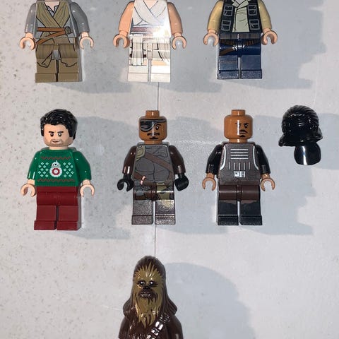LEGO Star Wars minifigurer i olika karaktärer och färger. Setet innehåller flera figurer med olika utseenden och tillbehör.