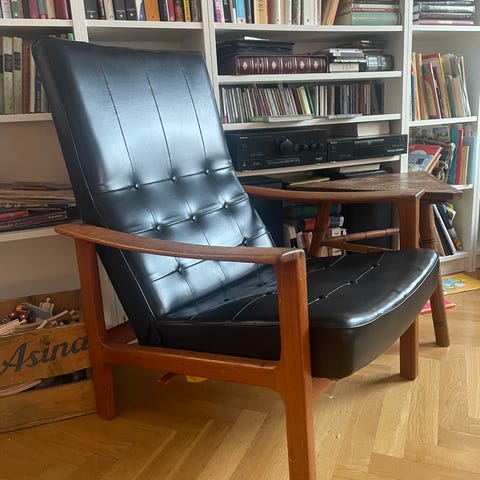 Fotöljen är lite sliten vid ena handtaget. Annars i nyskick.