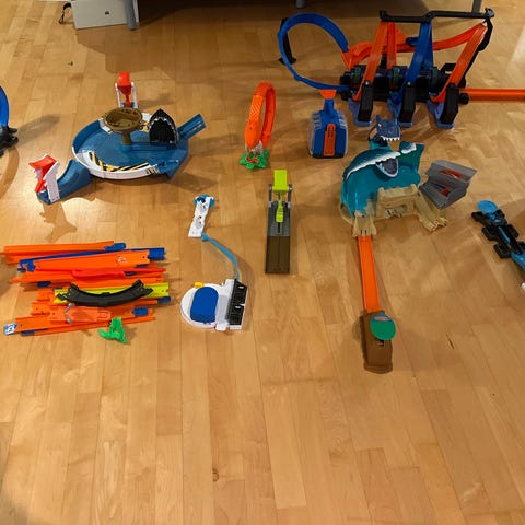 Många olika delar till Hot Wheels bilbana!