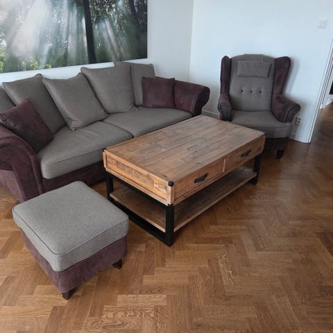 Beige lätt mönstrad soffa med trädetaljer i mahogny