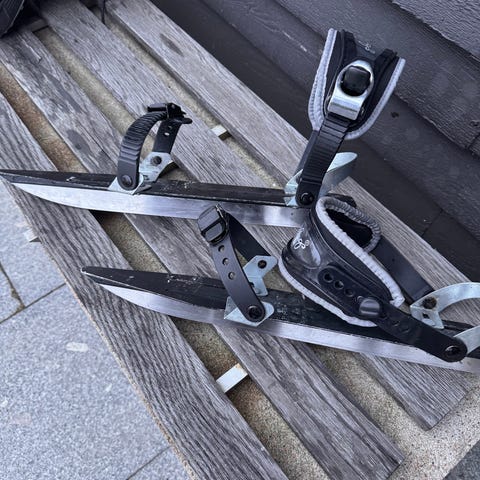 Isvidda skridskor längd 45cm med spännen för fastsättning som har en robust konstruktion inkl svarta kängor Everest stl 39/40. Allt mycket lite använda.