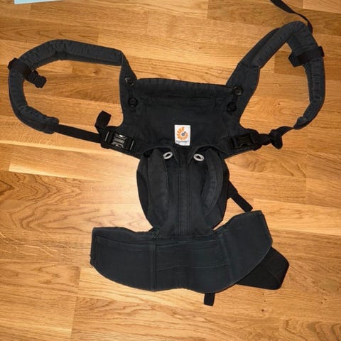Ergobaby bärsele i mörkblå färg. Designad för att ge stöd och komfort vid bärande av barn. Justerbara remmar för anpassning efter användarens kropp.