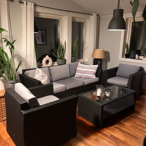 Möblerna har en ram i svart metall och flätad struktur i beige ton.
