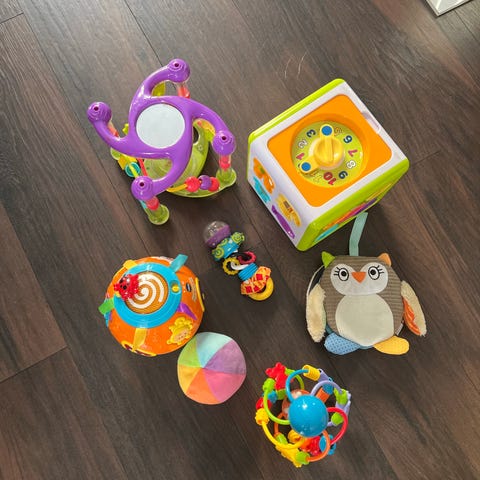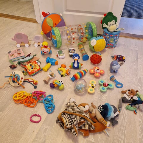 Säljer ett stort paket med baby- och småbarnsleksaker – både leksaker med ljud/ljus och mjuka leksaker. Allt har varit använt och lekt med, men är i fungerande skick.