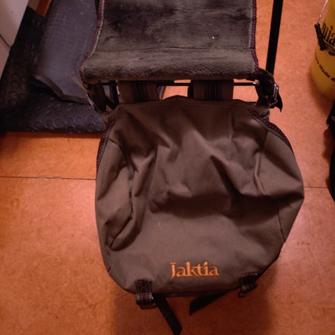 En ryggsäck med inbyggd sittpall i locket. Sitthöjd 47cm, bra höjd för mig på 180cm. Mycket stadig men lätt då den har en aluminiumstomme. Skulle gissa på att den rymmer minst 35L förmodligen mer.