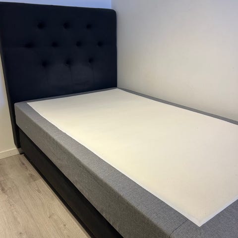 Jysk sänggavel i ljusgrått tyg. Passar för säng 120cm bred.