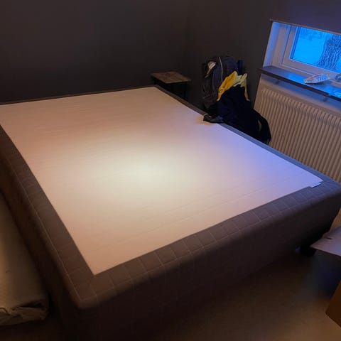 IKEA sängram i ljus färg med träben. Sängen består av två 80 cm breda resårmadrasser Skotterud med ljusbeige klädsel. Bäddmadrass Tustna 160 cm. Den ena resårmadrassen är fast och den andra medelfast.