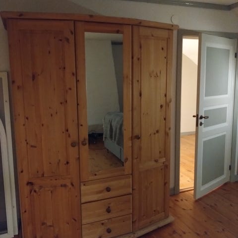 Vackert antikt garderobsskåp i massiv furu, tillverkat i norra Europa (troligen norra Tyskland) omkring mitten av 1800-talet. Skåpet är av så kallad zerlegbar / knock-down-konstruktion, vilket innebär att möbeln är byggd i separata sektioner för demontering och återmontering utan åverkan. Skåpet är byggt helt för hand med träpluggar och handhuggna sinkningar – inga spikar eller skruvar.