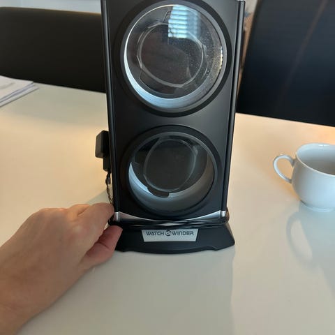 Barrington Watch Winder i svart färg. En enhet för att automatiskt vrida och hålla automatiska klockor igång. Kubformad design med anslutningar för in- och utgång på baksidan.