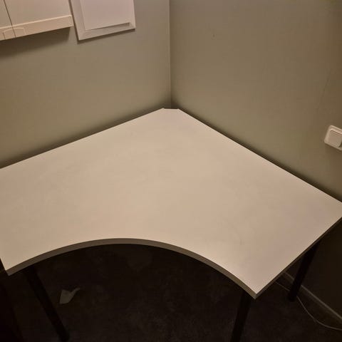 Stadigt och stort hörnskrivbord. Plats för dubbla datorskärmar. Lacken skadad i ena ändan av bordet. Justerbar höjd ca +/- 5 cm
