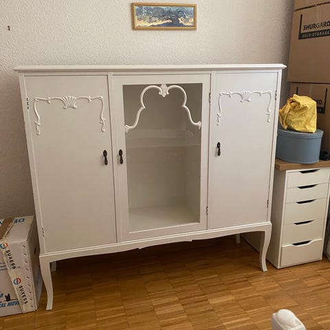 Skåpet är i en fransk stil blandat med det klassiska skandinaviska och är ett skåp som kan förvara porslin och glas, böcker, mm.