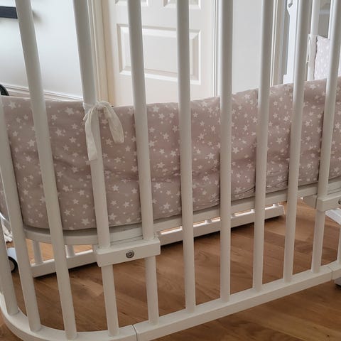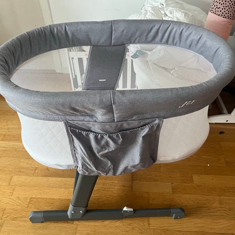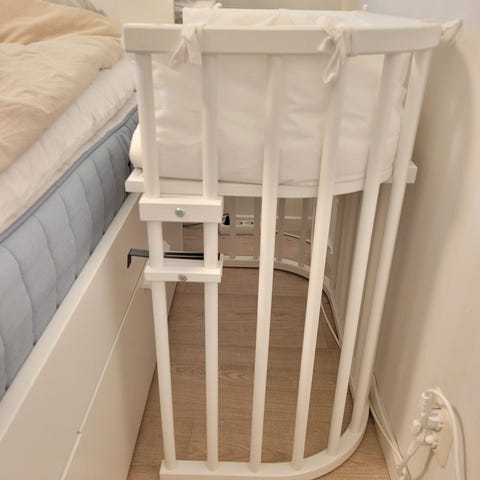 Babybay Bedside Crib i vitt trä. Säng för barn som kan placeras intill föräldrasängen för enkel åtkomst. Inkluderar madrass och lakan.