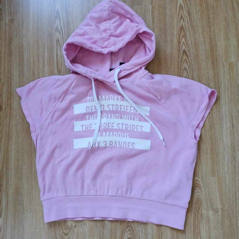 Helt ny kort gråmelerad hoodie i stl 160 med snörning i midjan.