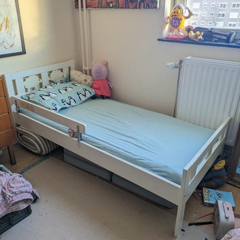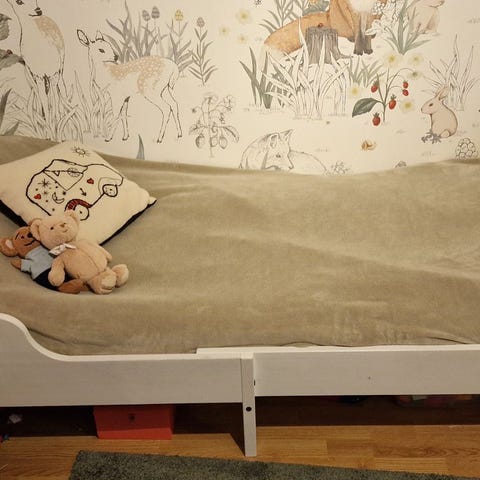 Säljer en IKEA Kritter juniorsäng med ribbotten. En robust och säker barnsäng med skyddande sänggrind som gör att barnet sover tryggt.
