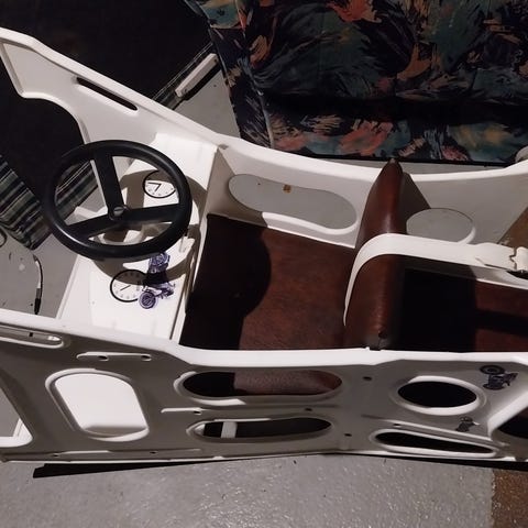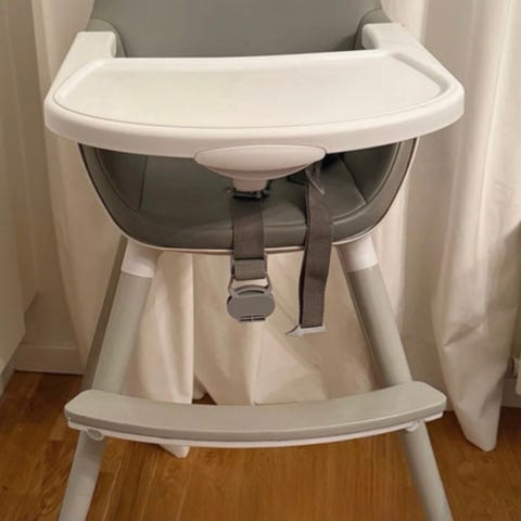 Barn-matstol, plast med avtagbar bricka. Endast midjebälte (trepunkts). Tung i foten.