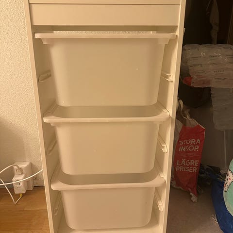 IKEA barn/förvaringsmedel Trofast med vita lådor i bra skick säljes; pris 400 kr (halva nypriset på 859 kr)