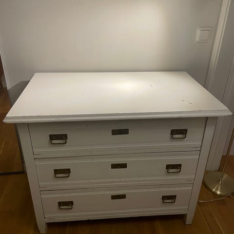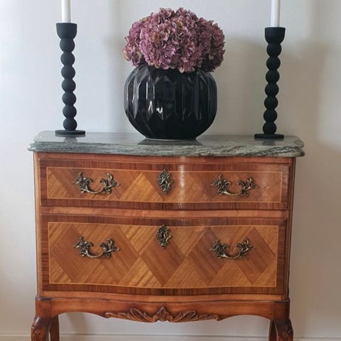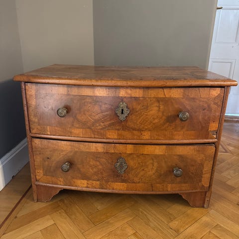 Antikt bord / byrå tillverkat i trä med två lådor för förvaring. Bordet har en sliten yta och böjda ben med tvärstag för stabilitet. Passar som ett mindre bord/byrå
