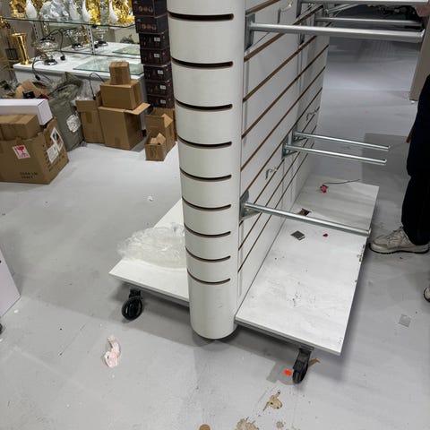 Gondol med spårskenor i aluminium och hyllor i ek. 4st draglådor i botten. Inklusive 13st hyllor 60x30, 4st hyllor 60x20 och konsoler för alla hyllor. Gondolens mått är 60x124x140.