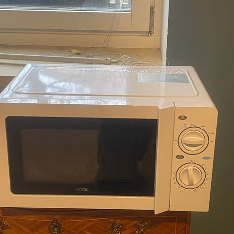 Matsui mikrovågsugn i vit färg. Utrustad med mekaniska vred för inställning av tid och effekt. Mikrovågsugnen har en roterande tallrik inuti för jämn uppvärmning.