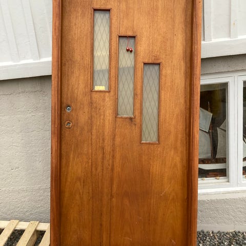 Säljer en vacker innerdörr från troligtvis 1950-talet med originalglas i tidstypiskt mönster. Klassisk design som passar perfekt i funkis- eller 50-talshus, men även som snygg kontrast i modern miljö.