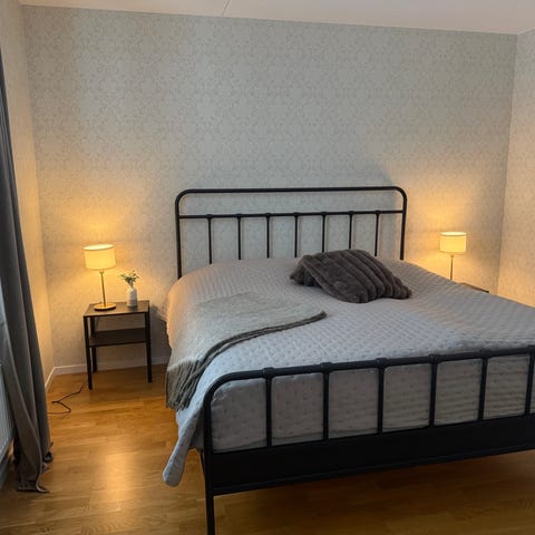 Överkast och kuddar ingår ej. Säng/resårbotten 180 cm (alt 2 x 90 cm) ingår ej, men finns på separat annons Blocket.