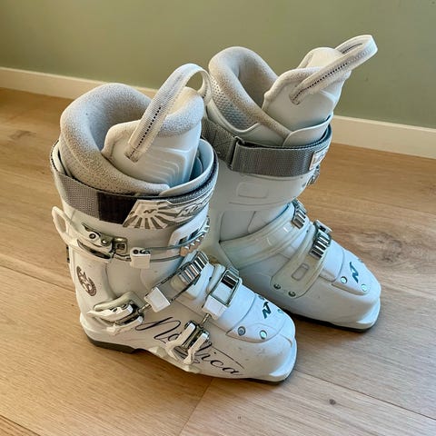 Rossignol Hero JR 65 skidpjäxor i storlek 23,5 cm. Färgen är vit med svarta och röda detaljer. Skidpjäxorna har fyra spännen för justering och är anpassade för juniorer. Köpta på Udens Sport i Göteborg.