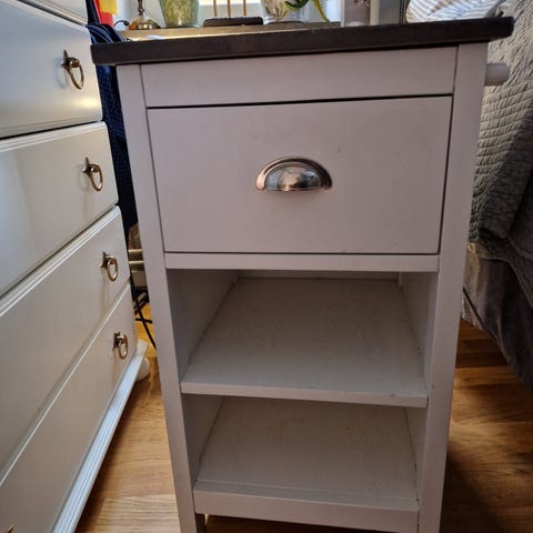 Avlastningsbord/piedestal/sängbord från Mio. I mörkbrunt folierat trä med underrede i svartlackerad metall.