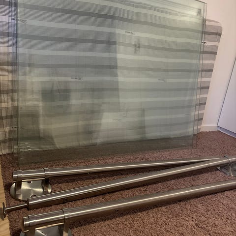 Säljer ett stilrent och modernt balkongräcke i glas med aluminiumstolpar och överliggare. Har suttit monterat på modern villa och ger ett öppet, exklusivt intryck med maximalt ljusinsläpp.