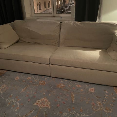 Det här en stor soffa som får plats med 4 personer. Soffan är väldig sjön och du sjunker in i den när du sitter. Det går också att sova på soffan. Kuddarna är rörliga och justerbara. Man kan använda dem som stöd eller använda det som en normal kudde. Kuddarna är väldig sköna och innehåller mjuka fjädrar. Soffan är gjord av tyg.