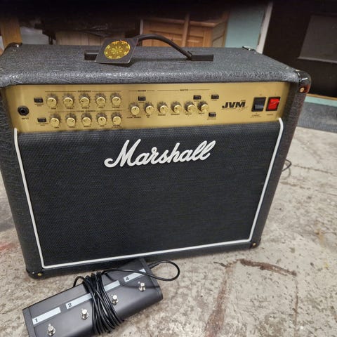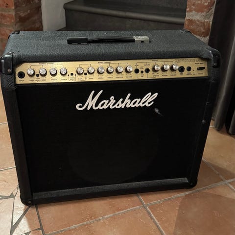 Marshall Valvestate 8080 förstärkare med flera reglage för ljudjustering och fotpedal.