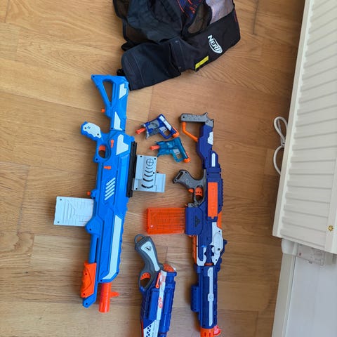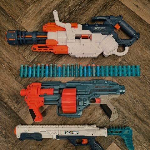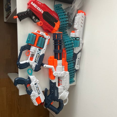 Nerf X-Shot Dart Blaster leksak för barn. Vit och orange färg med blå och svarta detaljer. Inkluderar flera blå och gula skott samt extra pilar. Tillverkad i plastmaterial. Man får med ankor som man kan skjuta på för att öva på sitt sikte.
