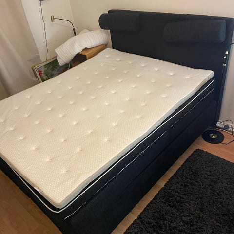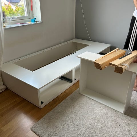 Komplett säng bortskänkes. Egentligen svart men omklädd i vitt tyg som går att ta bort om man vill.